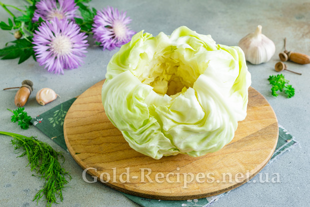Гострим ножем вирізаємо качан у молодої капусти. Акуратно відокремлюємо листя капусти від качана, щоб вони не порвалися і не потріскалися.