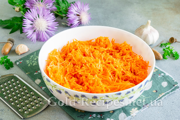 Готуємо начинку. Моркву миємо, очищаємо від шкірки, подрібнюємо на тертці з дрібним полотном. Перекладаємо терті овочі в глибокий посуд.