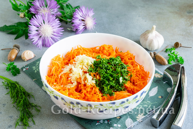 Додаємо до моркви пропущені через прес зубчики часнику та дрібно порізану зелень кропу. Перемішуємо начинку до однорідної суміші. Кількість часнику для рецепта можна регулювати на свій смак.