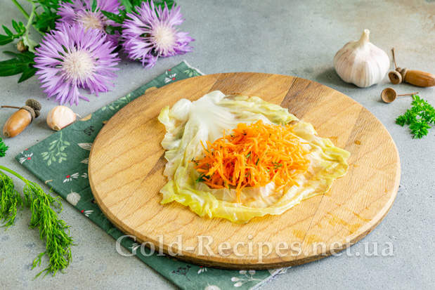 На середину капустяного листа викладаємо столову ложку начинки з моркви.