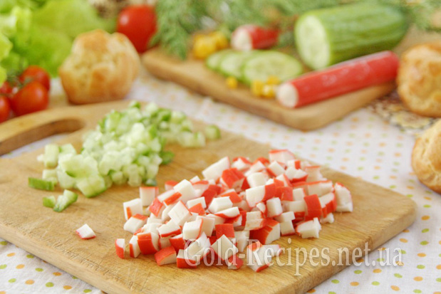 Займемося начинкою, якою будемо наповнювати профітролі. Розморожені крабові палички нарізаємо дрібними кубиками.