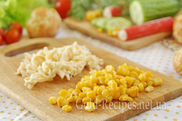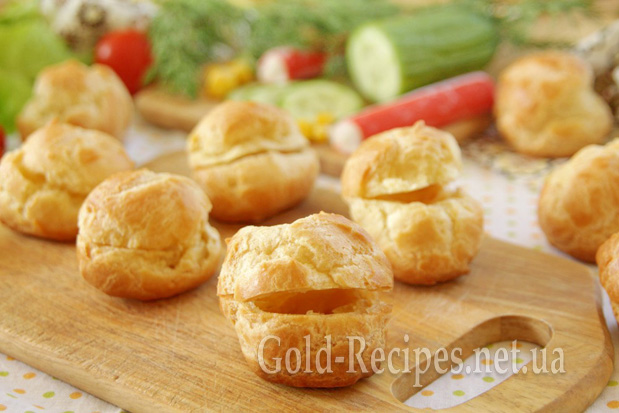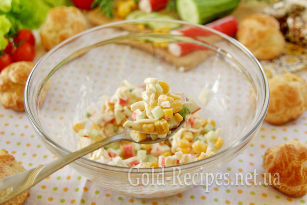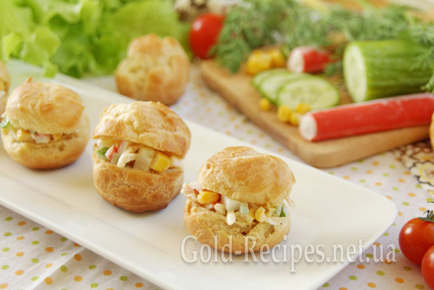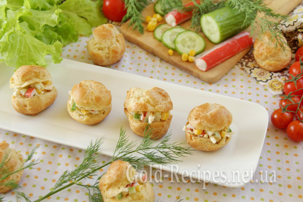 Я пропоную вам приготувати профітролі з начинкою з крабових паличок у компанії з плавленим сиром, консервованою кукурудзою і свіжим огірком.