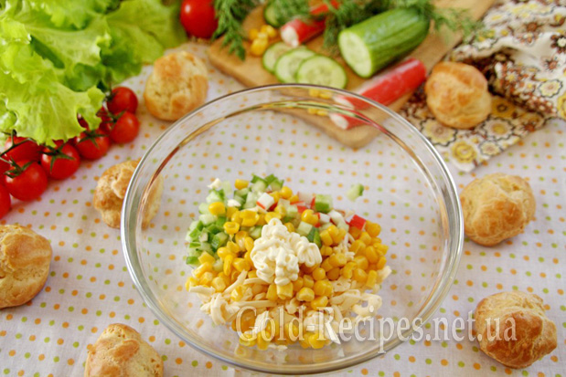 З’єднуємо всі підготовлені продукти: сирок, крабові палички, огірок і кукурудзу. Додаємо майонез.